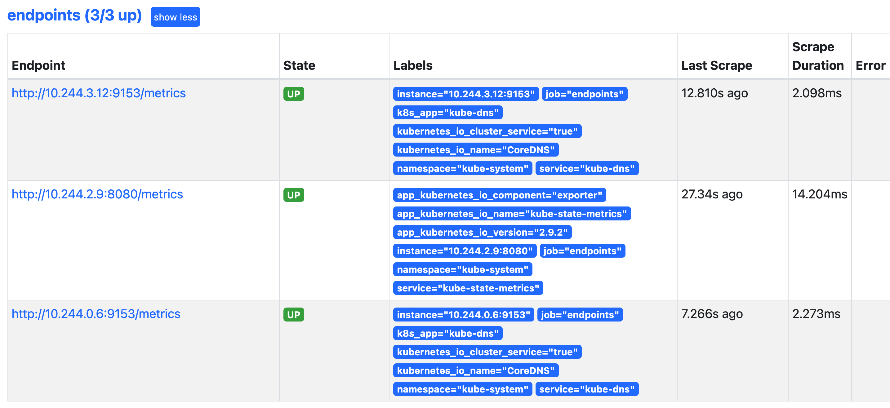 更新上面的 ClusterRole 这个资源对象,然后重建下 Prometheus 的所有 Pod,正常就可以看到 targets 页面下面有 endpoints 这个监控任务了: